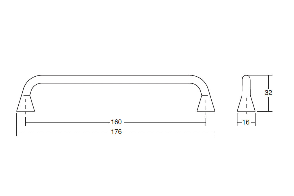 Wymiary: Rozstaw otworów 160 mm / Długość całkowita ok. 176 mm / Szerokość ok. 32 mm / Wysokość (odstawanie) ok. 16 mm