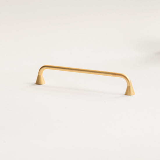 Stylowy uchwyt meblowy Bella wykonany ze stopu cynku w wykończeniu szczotkowanego złota. Smukła, stożkowa forma łączy industrialny charakter z nordycką elegancją, tworząc ponadczasowy detal pasujący do kuchni, szafek i nowoczesnych wnętrz. Idealny jako złoty uchwyt do mebli w stylu modern i classic.