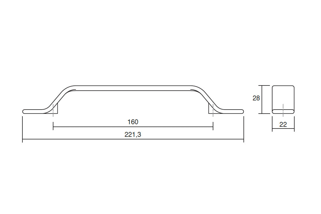 Wymiary: Rozstaw otworów 160 mm / Długość całkowita 221,3 mm / Szerokość 22 mm / Wysokość 28 mm