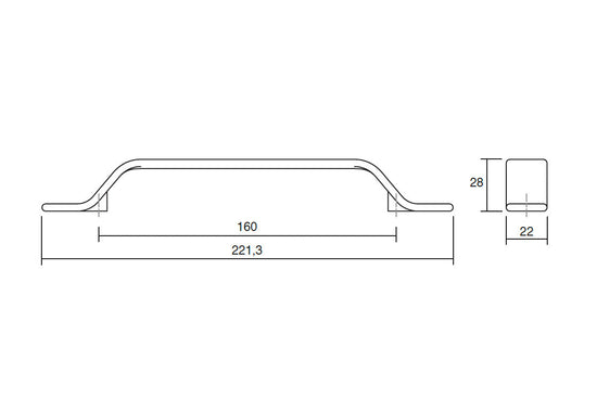 Wymiary: Rozstaw otworów 160 mm / Długość całkowita 221,3 mm / Szerokość 22 mm / Wysokość 28 mm