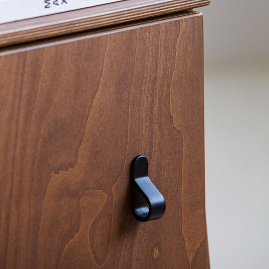 Używamy wysokiej jakości sklejki brzozowej, wyprodukowanej w Finlandii. Wszystkie nasze komponenty, takie jak prowadnice i zawiasy, są najwyższej jakości - używamy produktów marki Blum. Standardowe uchwyty, których używamy, są czarne, wykonane ze stali malowanej proszkowo, ale jeśli chcesz, abyśmy zamontowali inne uchwyty lub gałki, daj nam znać! Każdy mebel jest wykonywany na zamówienie, więc jesteśmy elastyczni w takich sprawach.