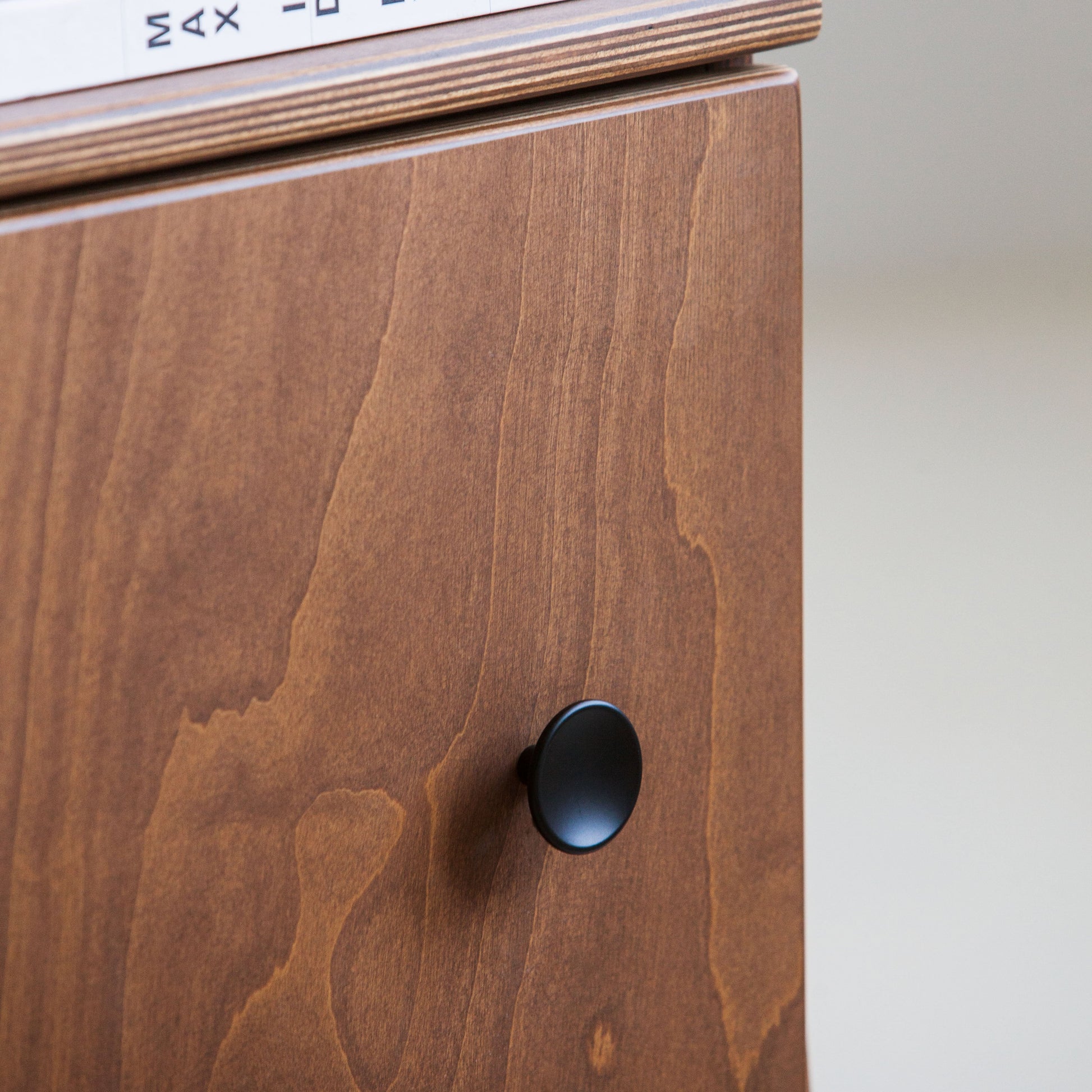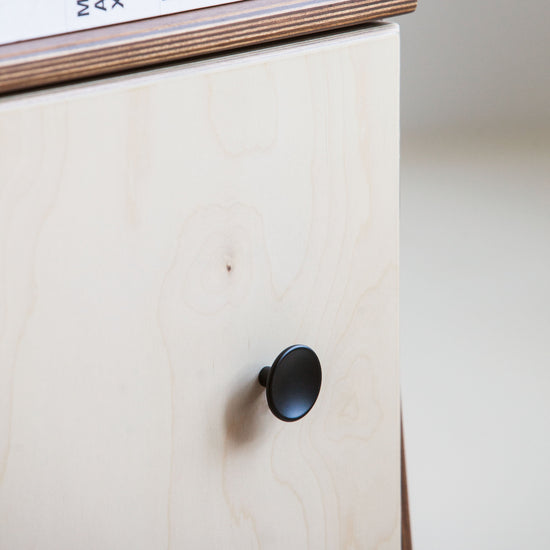 Używamy wysokiej jakości sklejki brzozowej, wyprodukowanej w Finlandii. Wszystkie nasze komponenty, takie jak prowadnice i zawiasy, są najwyższej jakości - używamy produktów marki Blum. Standardowe uchwyty, których używamy, są czarne, wykonane ze stali malowanej proszkowo, ale jeśli chcesz, abyśmy zamontowali inne uchwyty lub gałki, daj nam znać! Każdy mebel jest wykonywany na zamówienie, więc jesteśmy elastyczni w takich sprawach.
