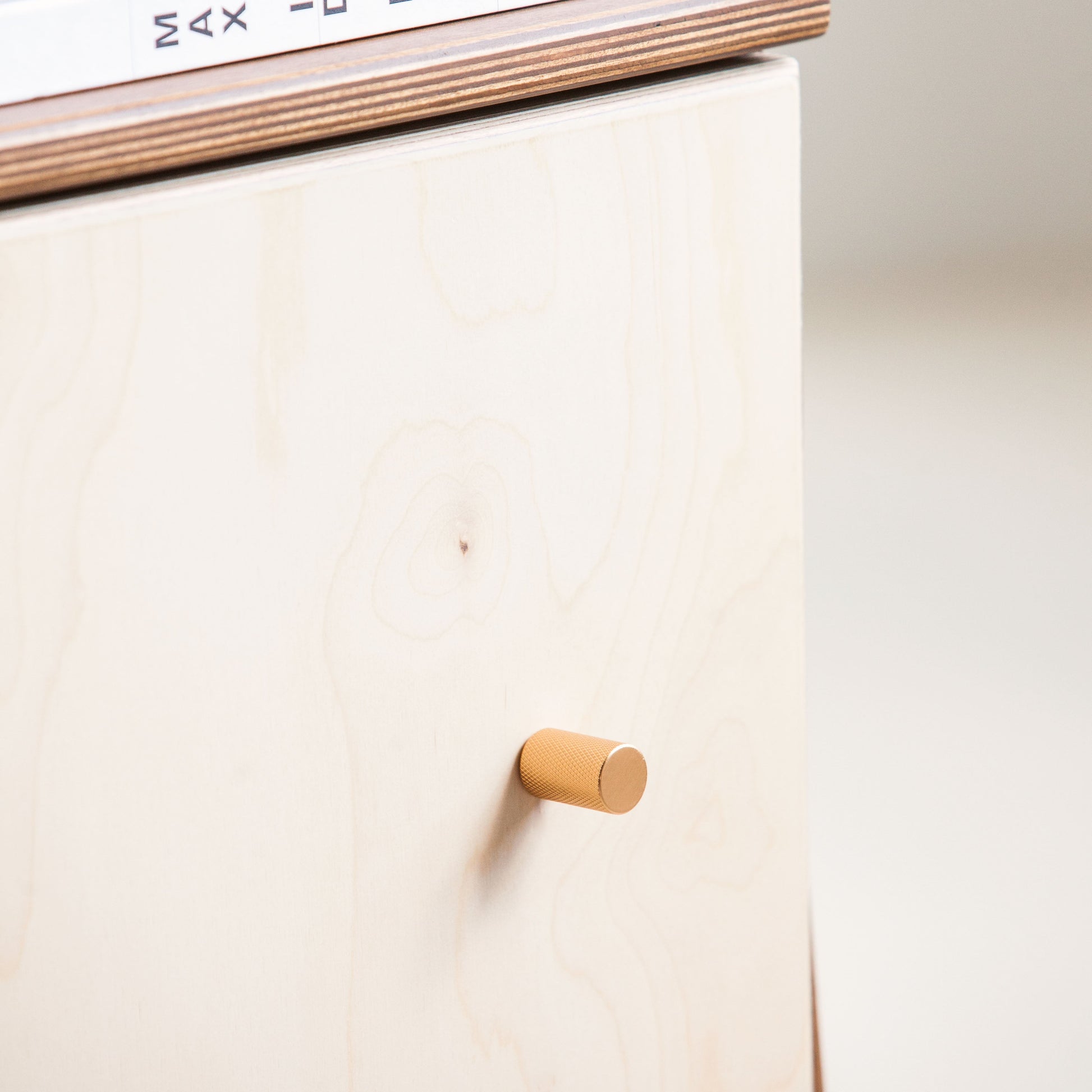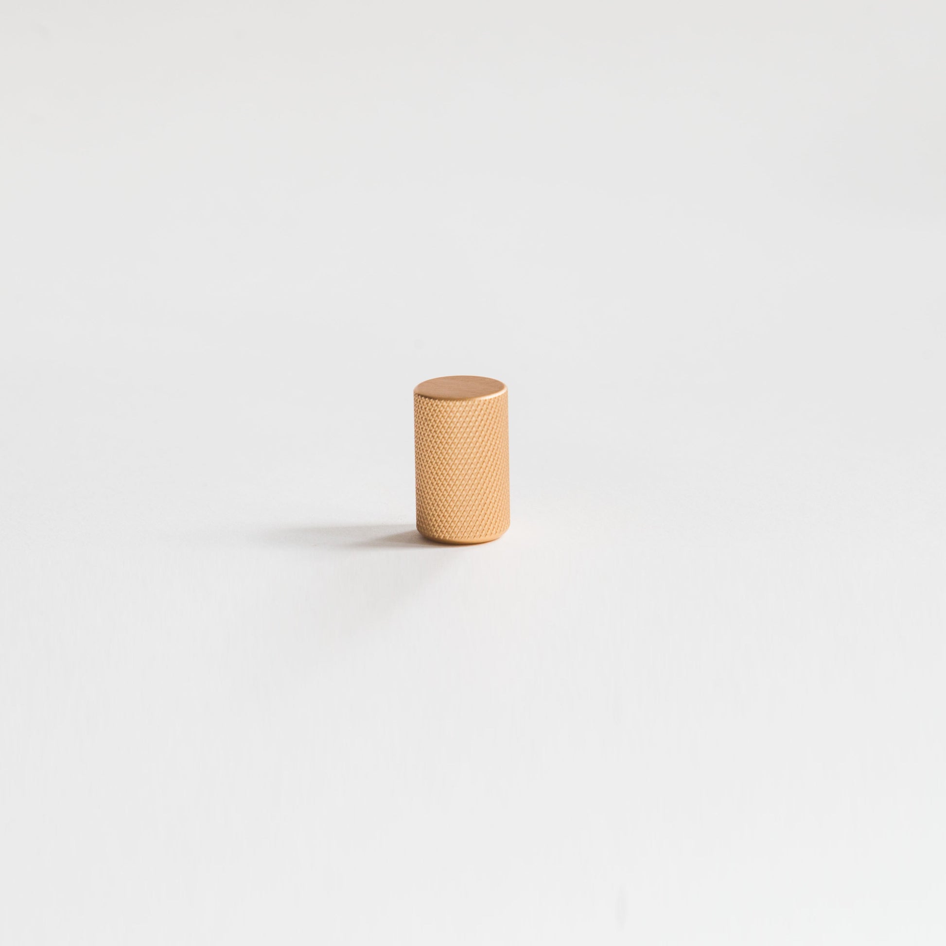 Solidna gałka meblowa Graf wykonana z aluminium w wykończeniu Brushed Brass. Jej industrialny charakter podkreśla fakturowana powierzchnia typu knurling, która zapewnia pewny chwyt i wyjątkowy wygląd. To złota gałka do szafek, kuchni i szuflad, łącząca funkcjonalność z odważnym akcentem stylistycznym w nowoczesnych wnętrzach.