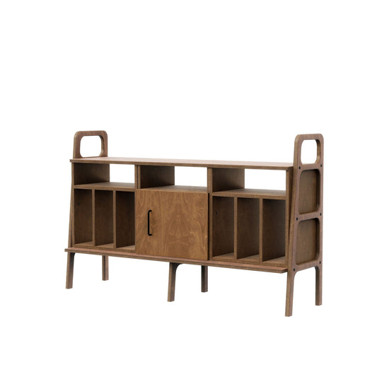 Drewniana komoda na winyle z szafką open 460 IX łączy wygodne przechowywanie płyt z miejscem na elektronikę. Dwa boksy winylowe mieszczą płyty pionowo i przejrzyście, a otwarta wnęka swobodnie mieści wzmacniacz lub odtwarzacz — z naturalną wentylacją i łatwym prowadzeniem kabli. Proporcje i detale w duchu Mid Century sprawiają, że mebel wygląda lekko, a jednocześnie jest pewny pod większą kolekcję.