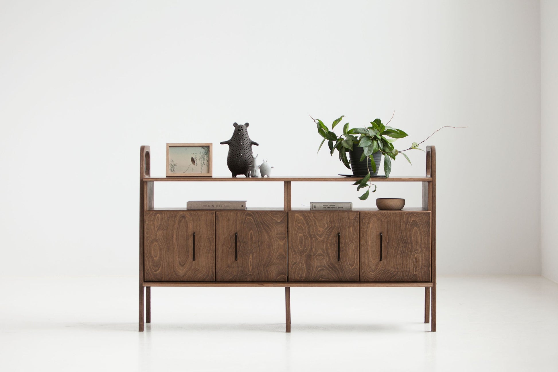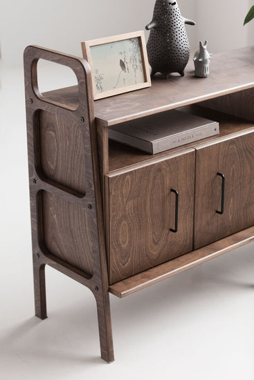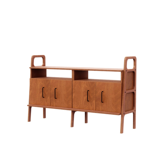 Drewniana komoda do biura 690 III zapewnia dużo miejsca na przechowywanie: dwie pojemne szafki porządkują dokumenty i akcesoria, a stabilny blat wygodnie mieści drukarkę, lampę lub dekoracje. Prosta, czytelna linia w duchu Mid Century łatwo wpisuje się w gabinet i home office, wprowadzając ład bez wizualnego ciężaru.