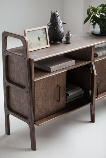 Używamy wysokiej jakości sklejki brzozowej, wyprodukowanej w Finlandii. Wszystkie nasze komponenty, takie jak prowadnice i zawiasy, są najwyższej jakości - używamy produktów marki Blum. Standardowe uchwyty, których używamy, są czarne, wykonane ze stali malowanej proszkowo, ale jeśli chcesz, abyśmy zamontowali inne uchwyty lub gałki, daj nam znać! Każdy mebel jest wykonywany na zamówienie, więc jesteśmy elastyczni w takich sprawach.