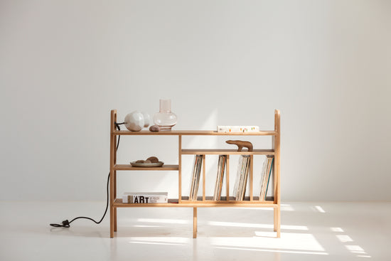 Minimalistyczne proporcje i spokojna geometria w duchu Mid Century sprawiają, że mebel wygląda lekko, nawet przy pełnym obciążeniu. Wykonujemy go ręcznie na zamówienie — po krótkim kontakcie mailowym dopasujemy szerokość lub wysokość oraz układ wnętrza (szuflady, szafki, otwarte półki), tak aby komoda precyzyjnie wpasowała się w Twoją przestrzeń.