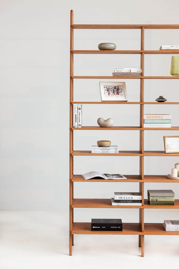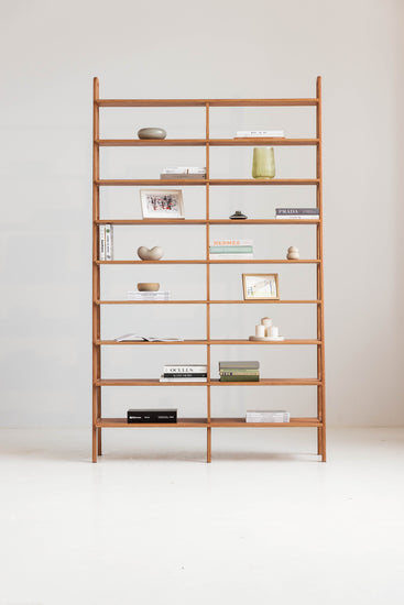 Drewniany duży regał na książki Double Maxi Plus tworzy uporządkowaną, dwukolumnową „ścianę” do salonu lub gabinetu. Dziewięć równych półek mieści książki, albumy i dekoracje, a spokojna geometria w duchu Mid Century zachowuje lekkość wizualną mimo dużej pojemności.