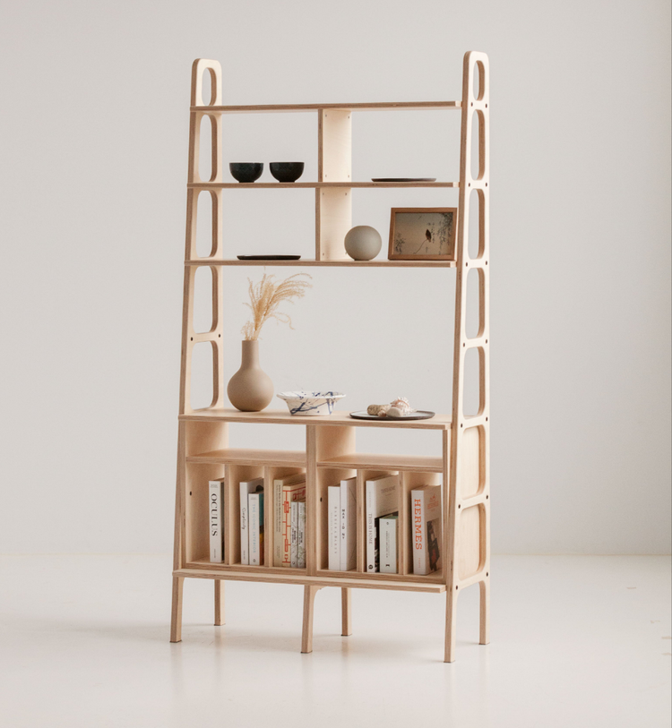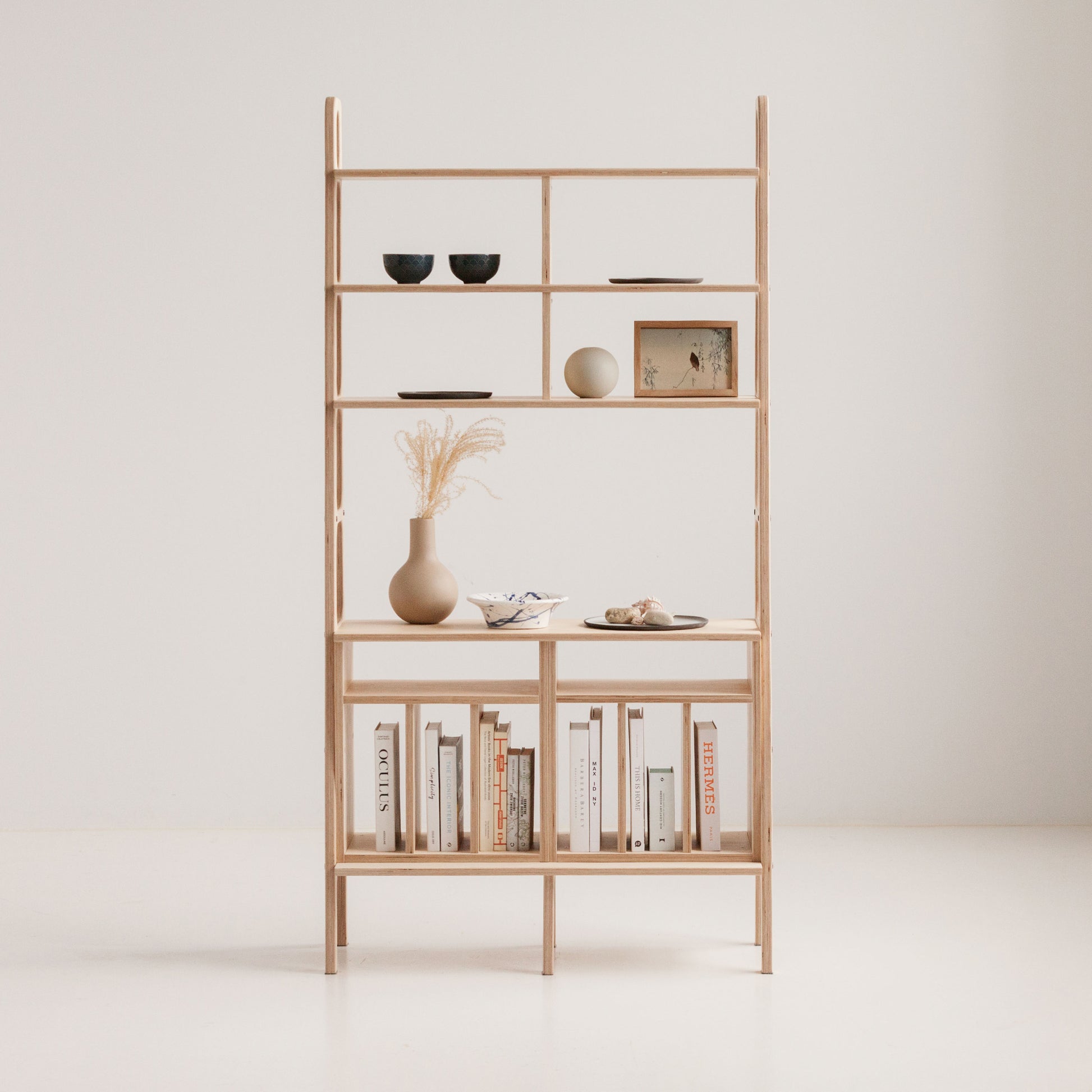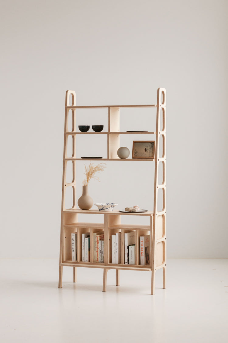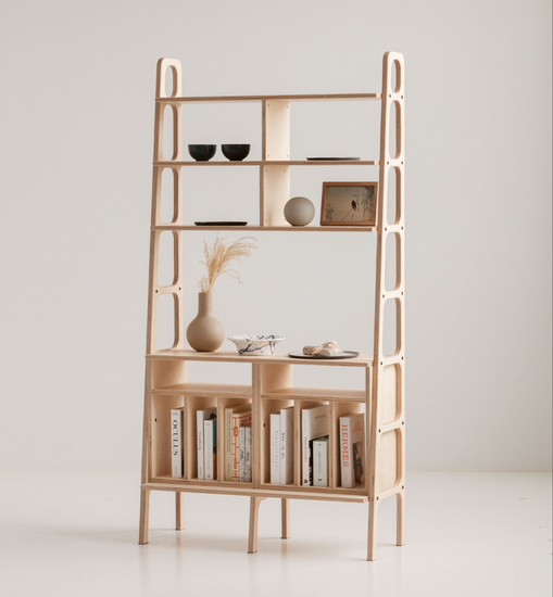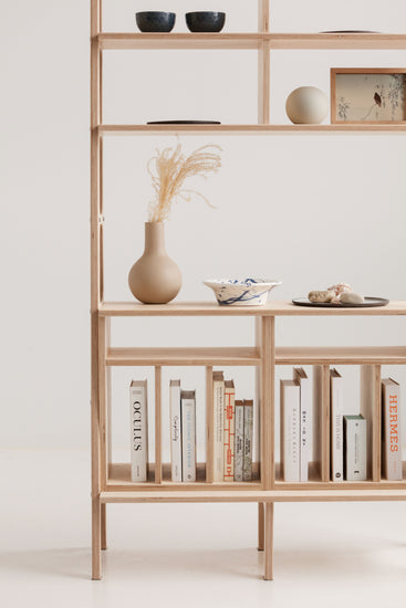 Drewniany regał japandi łączy porządek i spokój: proste linie, wyważone proporcje i lekka wizualnie bryła porządkują książki, ceramikę i drobne dekoracje. Naturalny charakter drewna ociepla wnętrze, a oszczędny detal pozwala meblowi „zniknąć” w aranżacji - to tło, które nie konkuruje z tym, co najważniejsze.