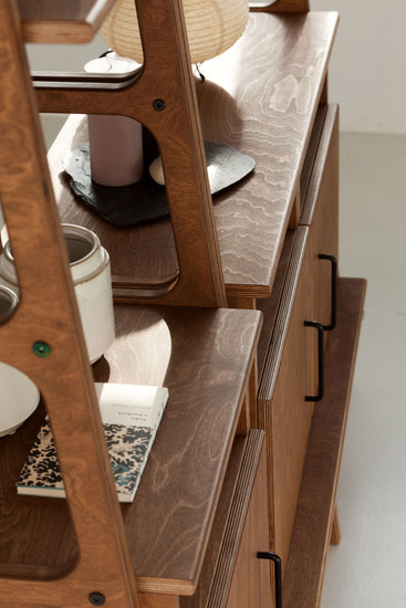 Używamy wysokiej jakości sklejki brzozowej, wyprodukowanej w Finlandii. Wszystkie nasze komponenty, takie jak prowadnice i zawiasy, są najwyższej jakości - używamy produktów marki Blum. Standardowe uchwyty, których używamy, są czarne, wykonane ze stali malowanej proszkowo, ale jeśli chcesz, abyśmy zamontowali inne uchwyty lub gałki, daj nam znać! Każdy mebel jest wykonywany na zamówienie, więc jesteśmy elastyczni w takich sprawach.